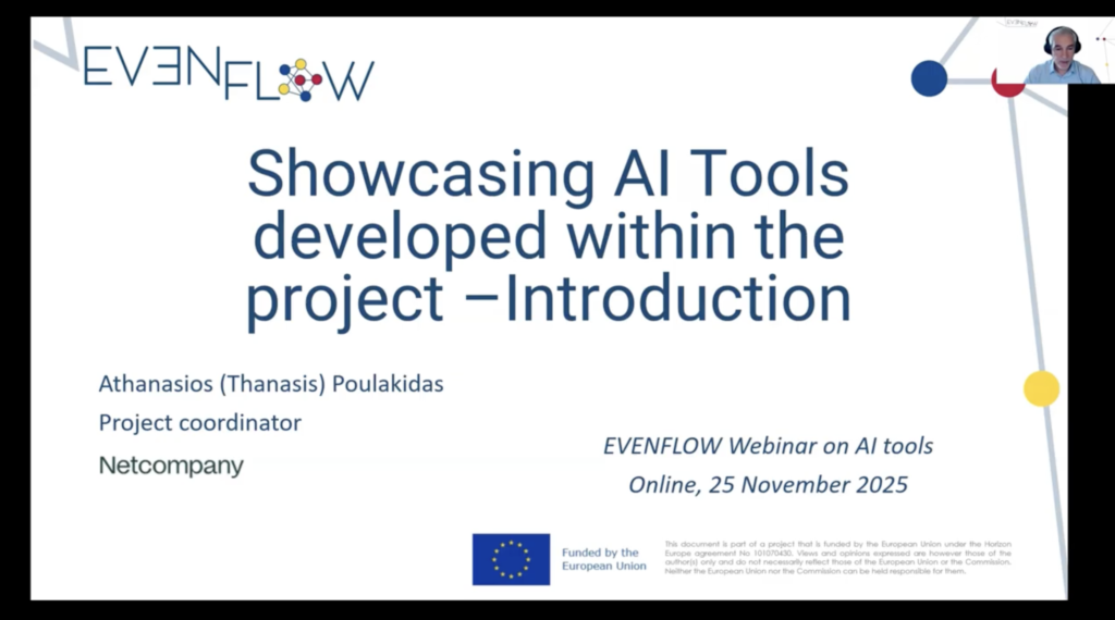 On 25 November 2025, the EVENFLOW project hosted its webinar titled Showcasing AI Tools developed within the project, bringing together researchers and practitioners for a live presentation of the project’s core technological outputs. The 90-minute session offered participants a guided tour through the AI tools developed within EVENFLOW, demonstrating how hybrid, neuro-symbolic methods can make AI systems more scalable, explainable and trustworthy.